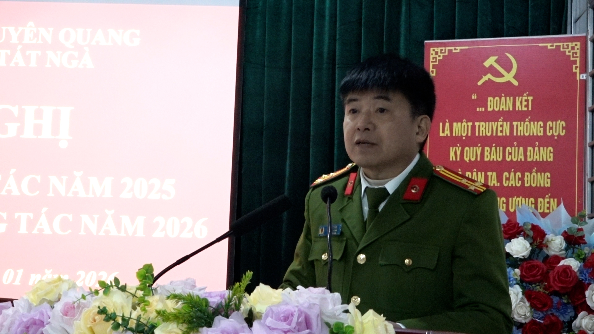 Phát biểu chỉ đạo tại Hội nghị, đồng chí Thượng tá Võ Bá Châu biểu dương những kết quả đạt được của Công an xã Tát Ngà trong năm 2025; đồng thời yêu cầu đơn vị tiếp tục phát huy tinh thần đoàn kết, chủ động, sáng tạo, thực hiện thắng lợi các nhiệm vụ công tác trong năm 2026.