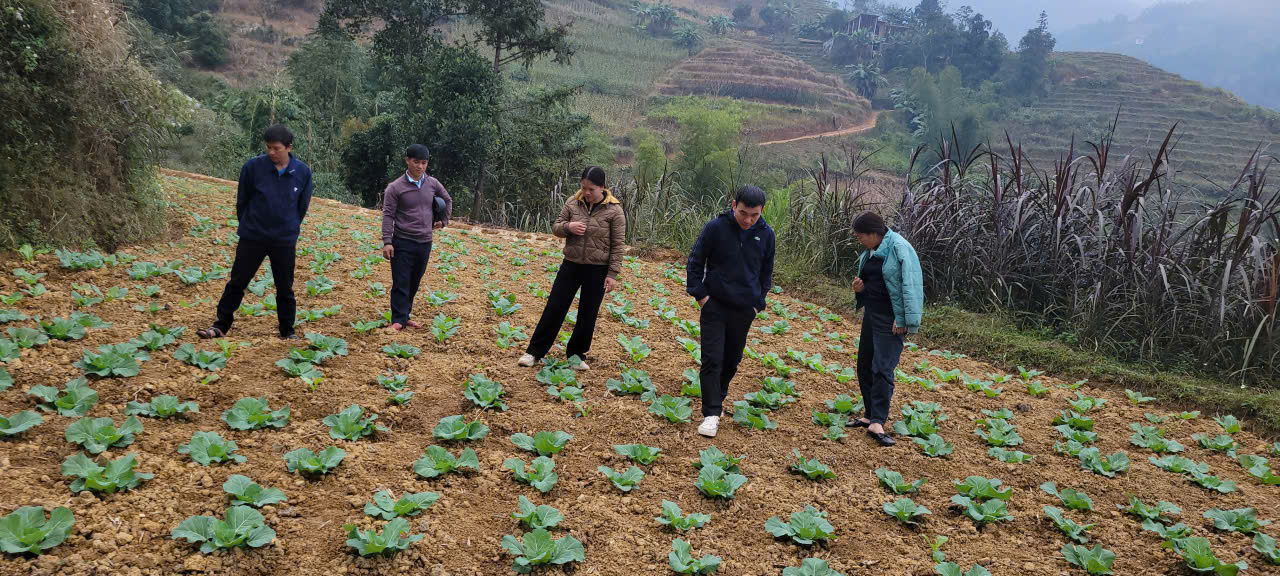 Cán bộ Trung tâm Dạy nghề xã Mèo Vạc phối hợp với lãnh đạo Hội Liên hiệp Phụ nữ xã Tát Ngà kiểm tra, đánh giá mô hình trồng rau an toàn tại thôn Bắc Làng.